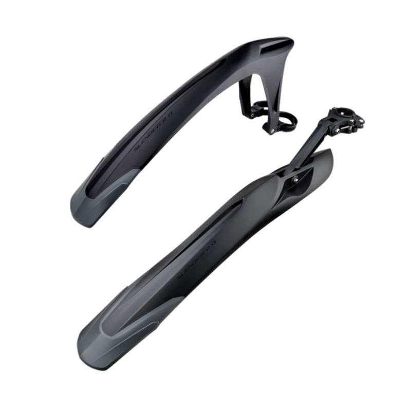 Ich spód jest gładki dla lepszego odprowadzania błota. Ich opływowy kształt skutecznie minimalizuje opór powietrza. Przedni błotnik jest mocowany do widelca za pomocą adapterów i 4 gumowych O-ringów. Tylny błotnik jest montowany za pomocą regulowanego zacisku. Dzięki temu montaż jest szybki i nie wymaga użycia narzędzi.