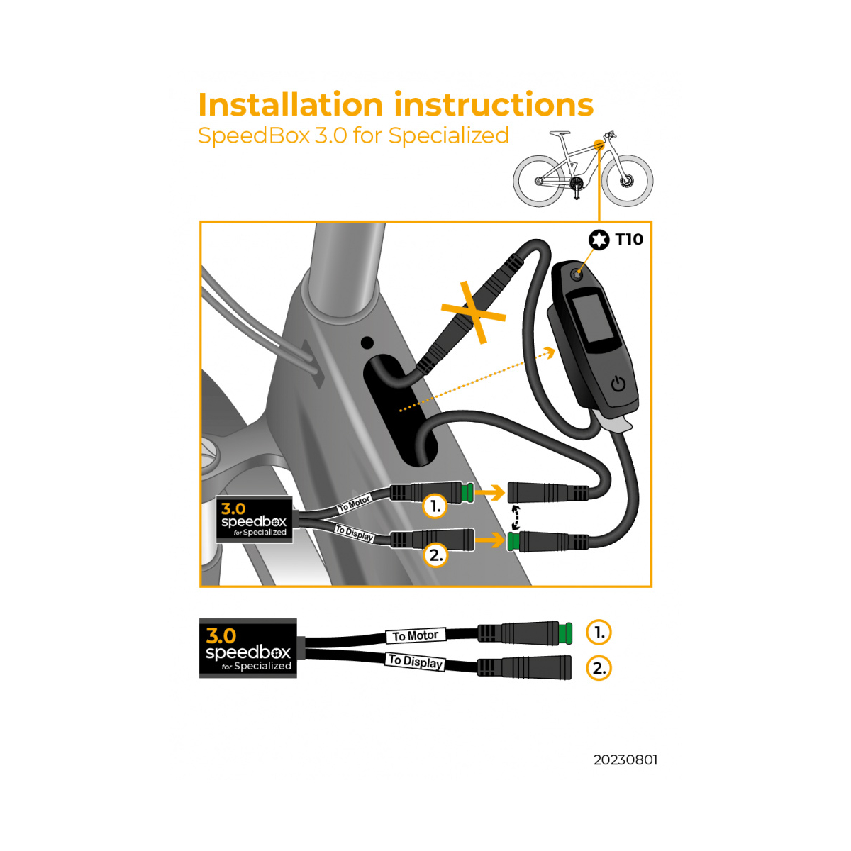 Instalujesz SpeedBox 3.0 w ramie roweru elektrycznego pod jednostką TCU/TCD. Wyświetlacz pokazuje maksymalną prędkość wspomagania 50 km/h. Możesz zapisać aktywację tuningu, wyłączając i włączając e-rower dwa razy. Potem tuning jest nadal aktywny.